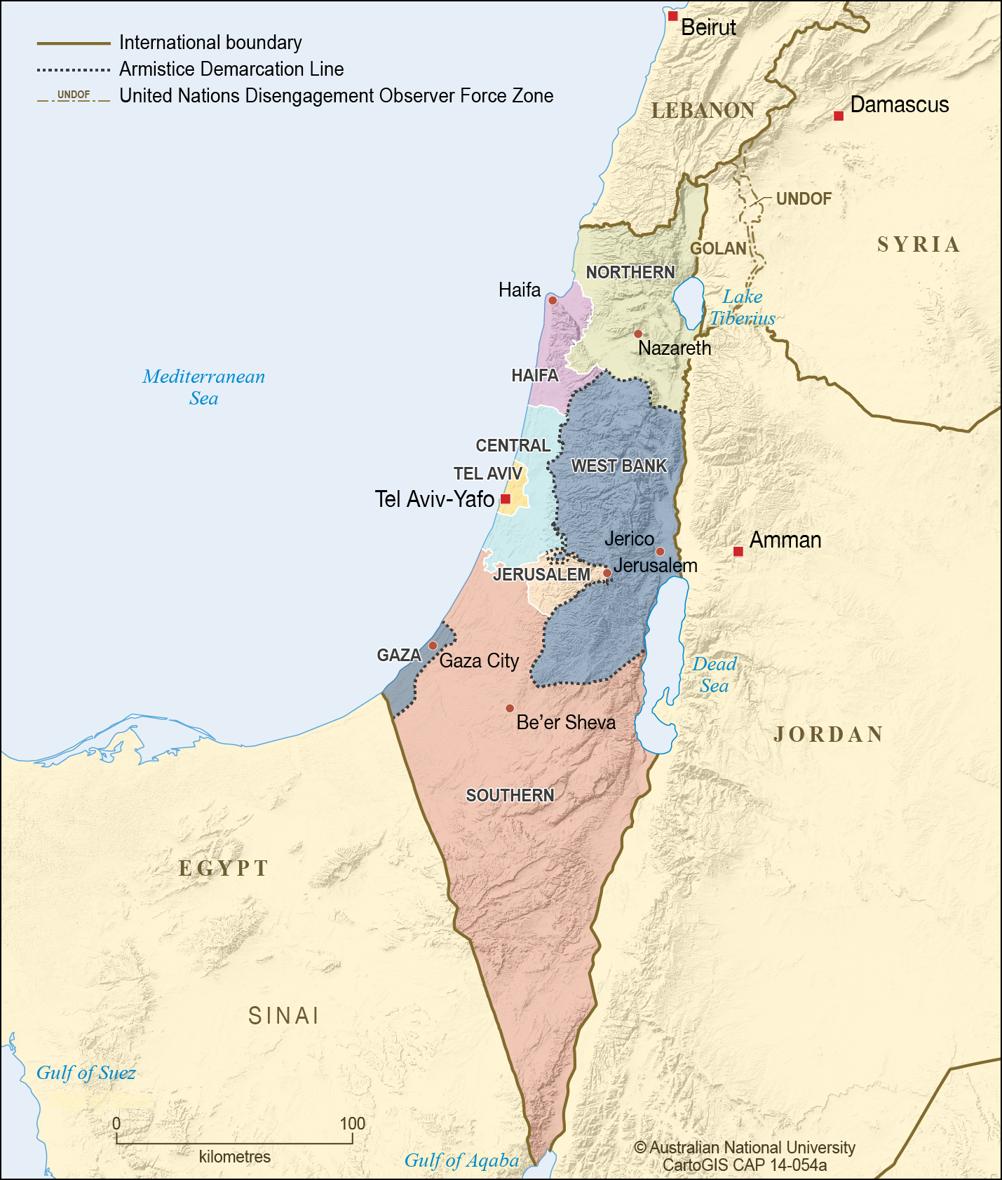 Israel, Gaza Strip and West Bank showing Armistice Demarcation Line, United Nations Disengagement Observer Force Zone, districts and capital cities.