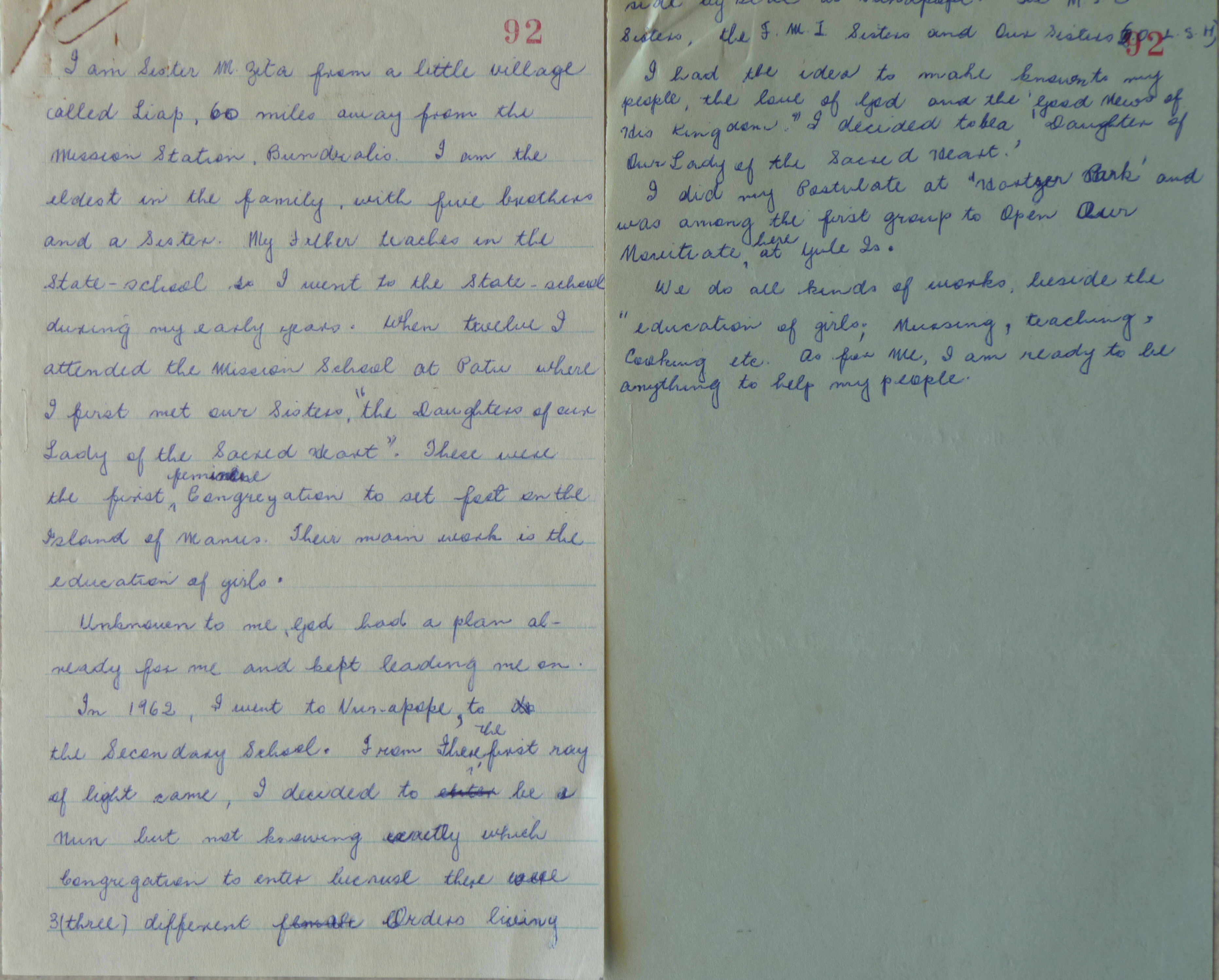 Hand-written biographical notes by Sister M Zita